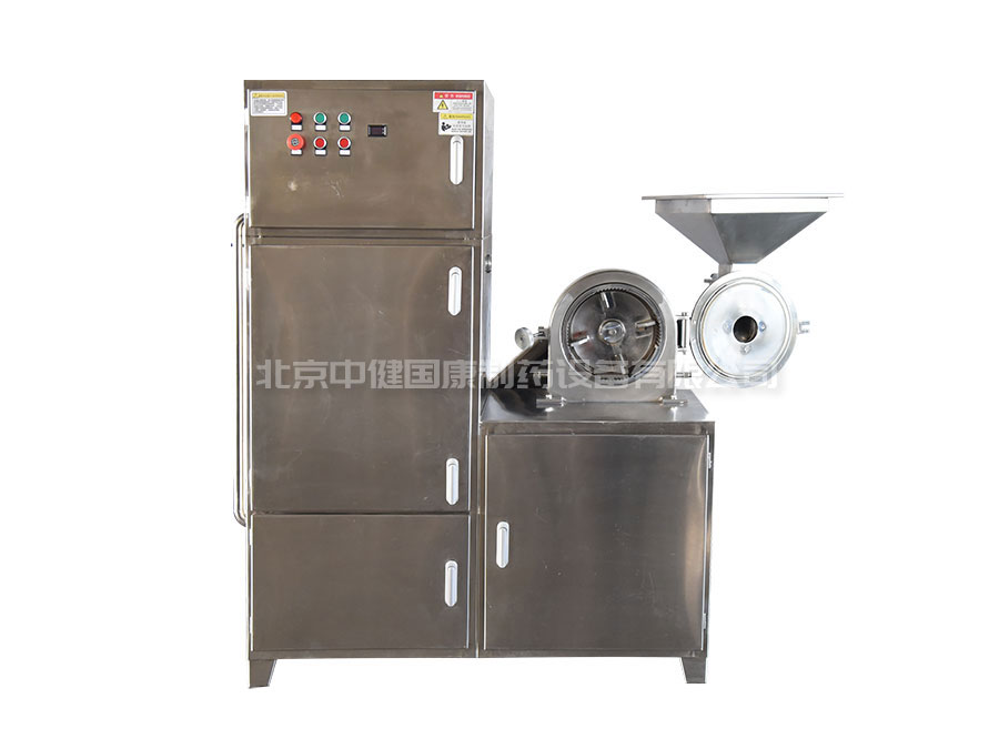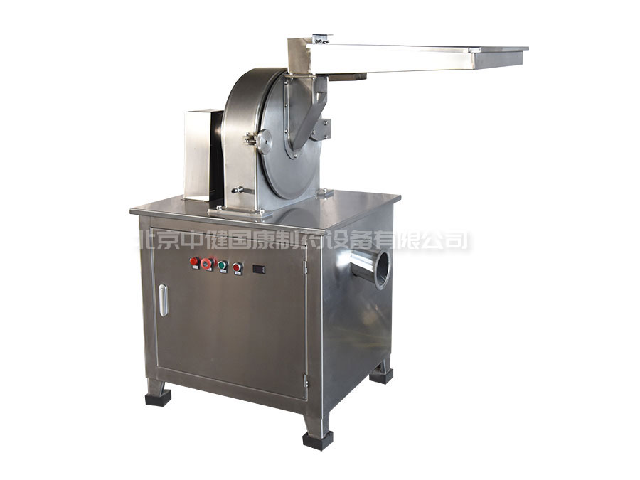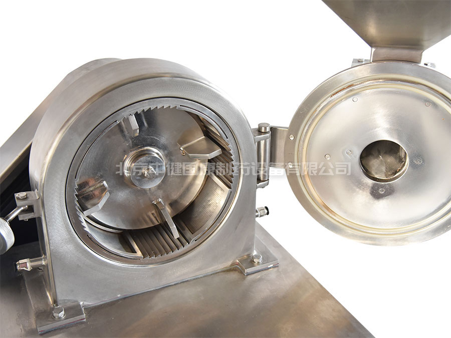 本机采用了风轮式高速旋转刀,定刀进行冲击、剪切研磨,粉碎时机腔内产生了强力的气流,把粉碎室的热量和成品一起从筛网流出,粒度大小通过更换筛网获得。