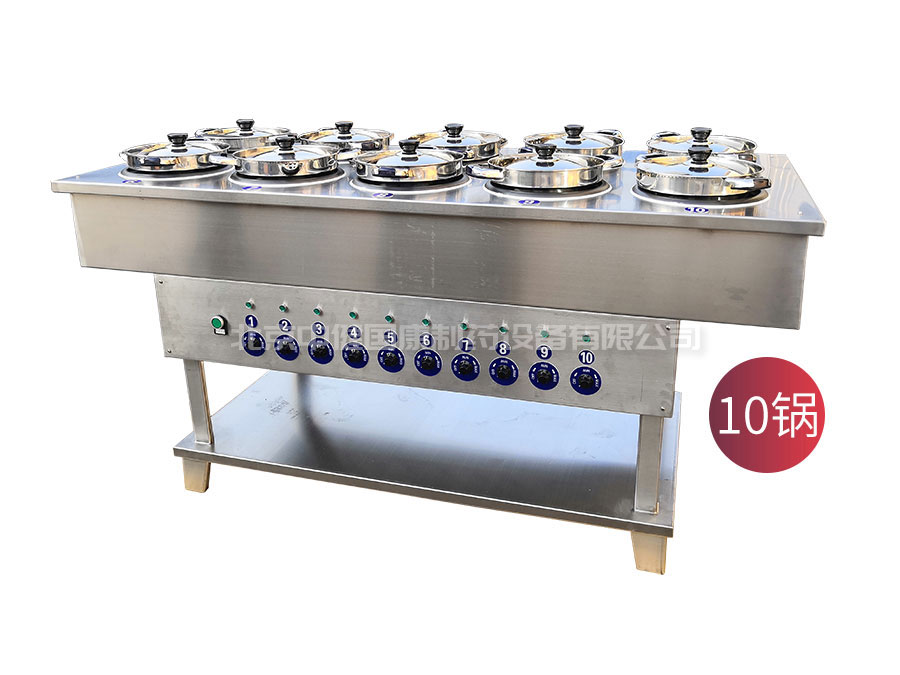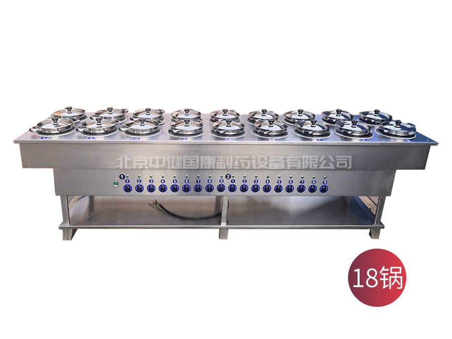多锅煎药机共4、6、8、10、12、14、16、18、20、24、30个或任意灶位,既可以单灶方式,也可以全控方式工作,充分适应不同煎药的方式要求。