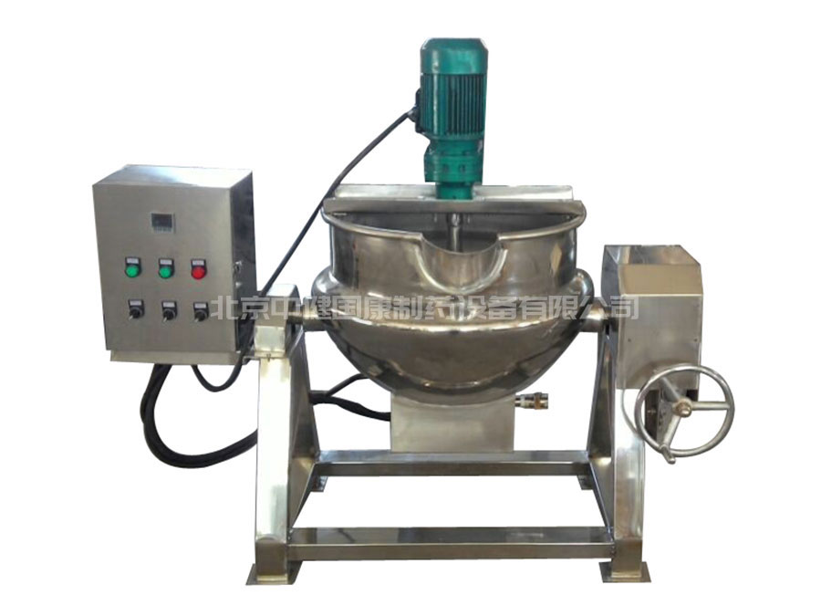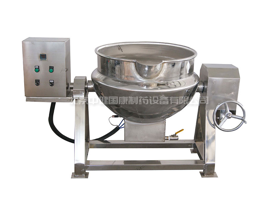 可倾反应锅可蒸、煮、浸提、浓缩草药,也可用于制作蜜丸中的炼蜜。可倾反应锅由主体、支架、蜗轮、蜗杆等组成。夹层通入蒸汽加热,或者使用电加热。