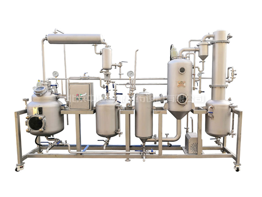 药热回流提取浓缩机组是综合了回流、渗漉提取、逆流提取与热回流抽提浓缩四种提取原理,将药的提取、浓缩两道工序同时进行,一次完成药提取、浓缩新工艺,并改进提取罐内带压于常压的高温煎煮工艺,利用真空负压进行低温提取低温浓缩,使提取罐内的工作温度控制在60~80℃,浓缩温度控制在50℃~70℃,保持了药材有效成份不被蒸发流失。同时将提取、浓缩产生的蒸汽经热冷器冷凝,回流到提取罐中,作为新溶剂加到药材里面,新溶剂从上至下通过药材层,起了动态渗漉作用,溶解药材的可溶性物质到达提取罐底部,进入浓缩器进行浓缩。根据多年的实践与研究,在真空低温汽化热的作用下,浓度差越大,有效成份提取率越高,回流的热冷凝液根据相应的型号规格在合适的时间内将提取罐原溶剂全部更换一次,使提取罐内药材组织中溶质与浸出液中的溶质在单位时间能保持一个较高的浓缩差。